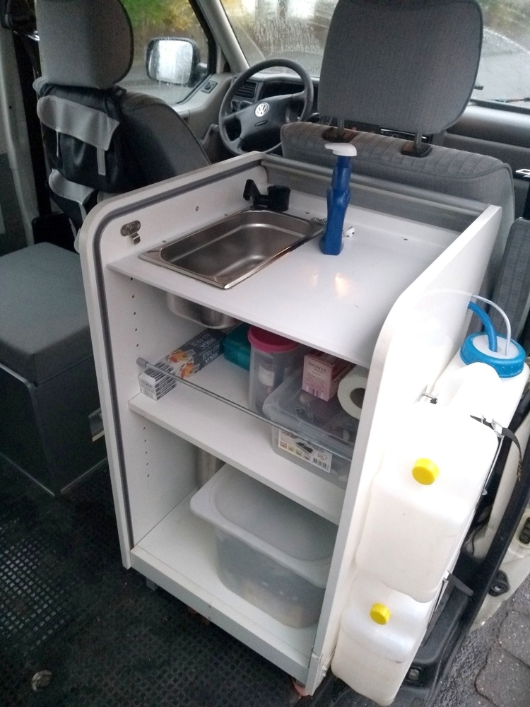 Im Dach- und Küchenschrank findet ihr ein bisschen Platz um das nötigste zu verstauen. Zum Kochen dient ein einflammiger Gaskocher, der sowohl drinnen als auch draußen genutzt werden kann. Geschirr und Besteck ist an Board.