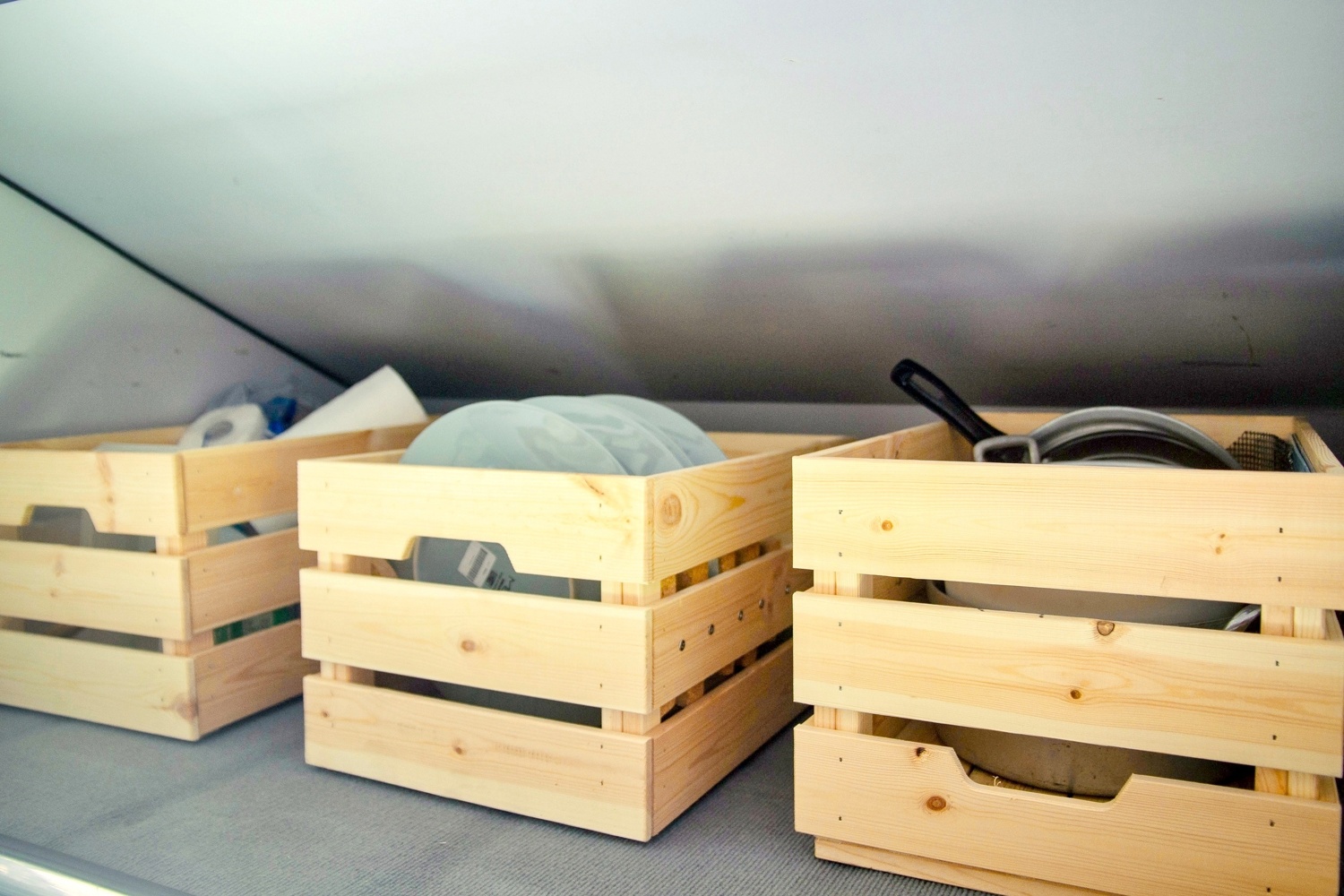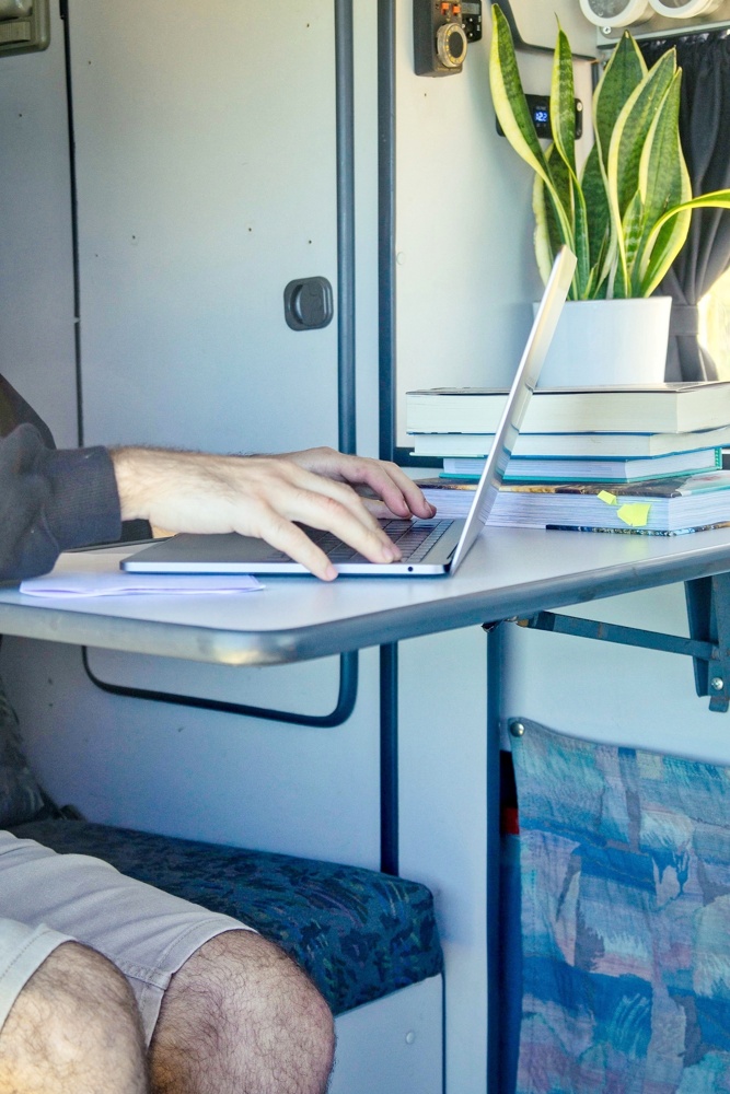 You can also find a radio with USB input, a mini-library for leisure time, a multiple USB inputs to charger everything you need, table and chairs for outside, a dishwater kit, 30 liters of water, storage to keep your things, and a chemical toilet.